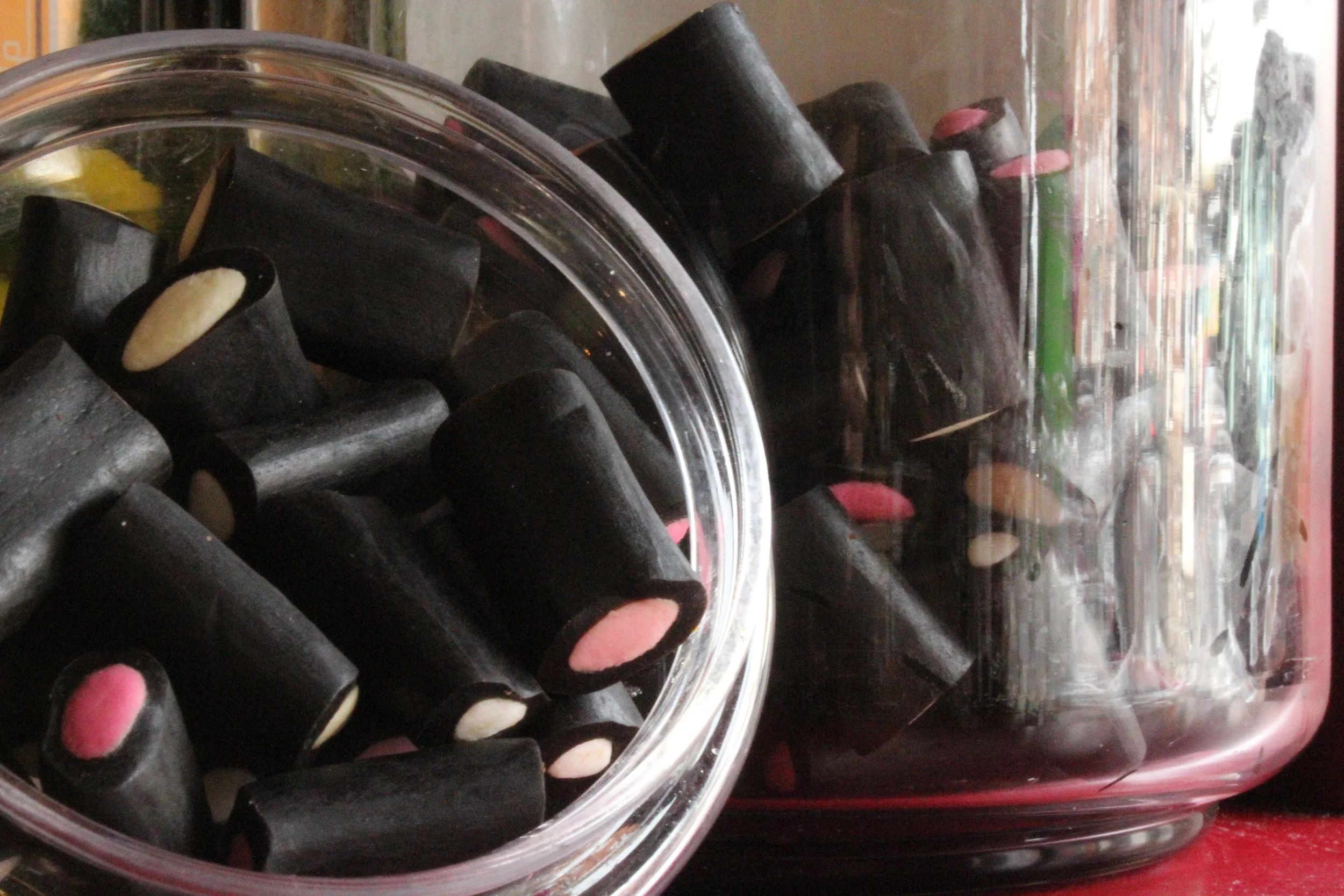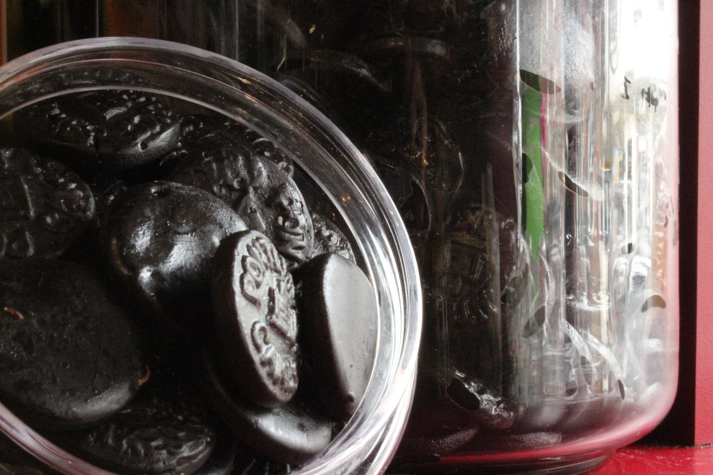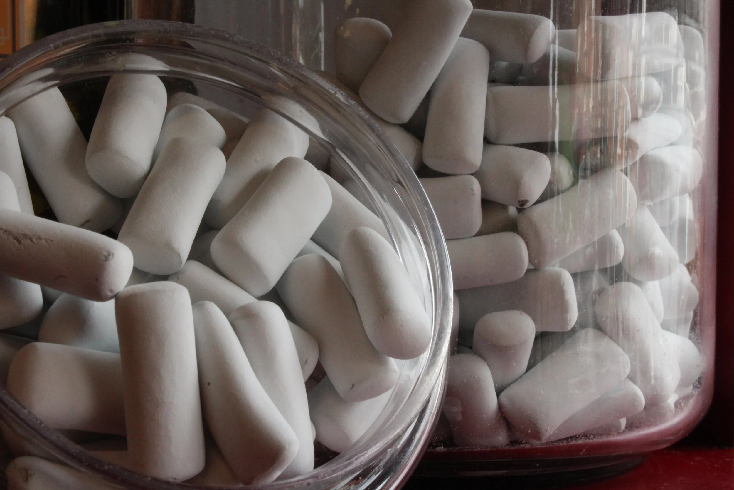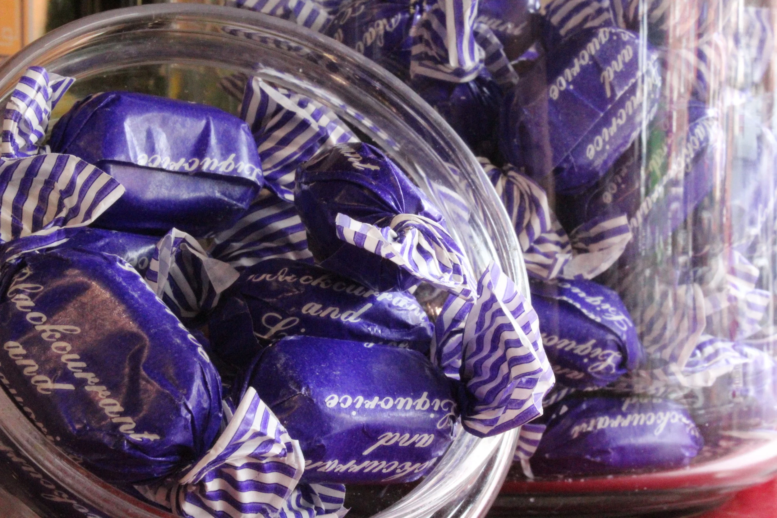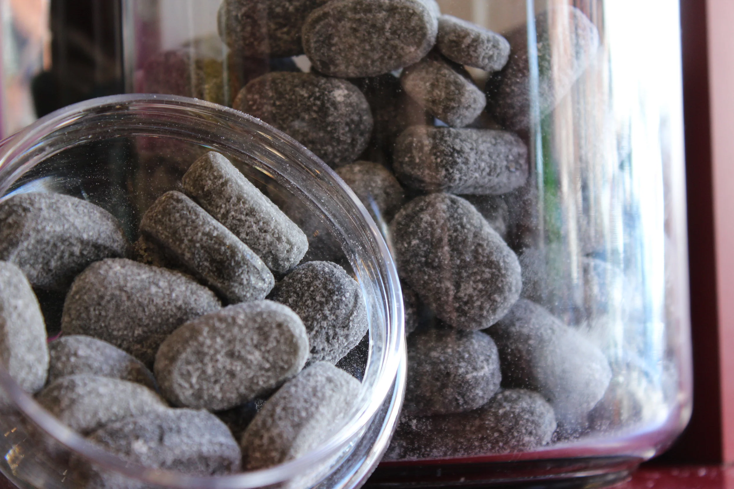 Thickener: natural acacia gum, sugar cornsyrup, black gums: natural liquorice, brown cough drops, natrual flavours, soft gums, sugar, cornsyrup, gelling agent, edible gelatin mints, sugar, natural mint flavour, colour, patent blue hard and soft gums, acid gums, edible acid, citric or tartric acid, natural and artifical flavours, colours: yellow quinoline, green quinoline and petent blue, orange, yellow pink and red azorubine, purple azorubine, brown, caramel, black carbon medicinals vegetalis, glazing agent steam or officinal paraffin.